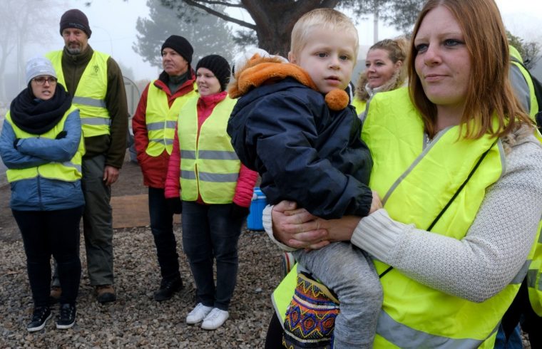 A woman wearing a yellow vest (Gilets jaunes) holds a child during a protest against rising oil prices and living costs at the highway’s toll of Villefranche de Lauragais, on December 11, 2018. (Photo by REMY GABALDA/AFP/Getty Images)